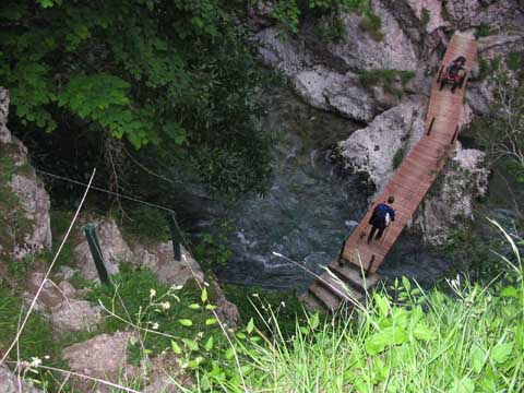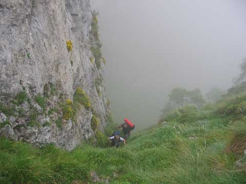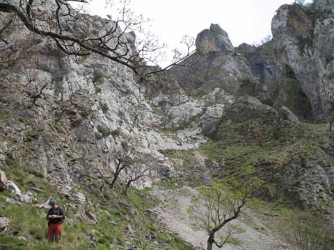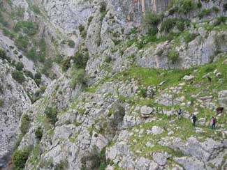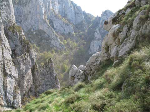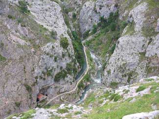 Por los peldaños de piedra del Travieso Cámara llegamos a la cueva Camara, no sin antes superar enormes dudas de orientación. El Cares se despliega al fondo.