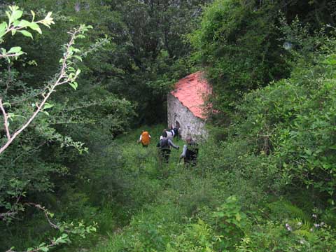 Continuamos descendiendo por zona sombreada de árboles, y la vegetación se espesa hasta el punto de hacerse incómodos sus ortigales. Una de las cabañas con apariencia de uso.