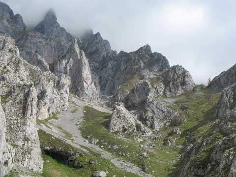 Cuando llevamos un buen tramo de descenso miramos hacia atrás y vemos el pedregal superior de la canal de Piedra Bellida que se esconde en retorcida a la izquierda ,y el verde hacia el Horcado Turonero a la derecha.