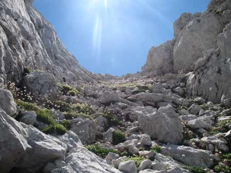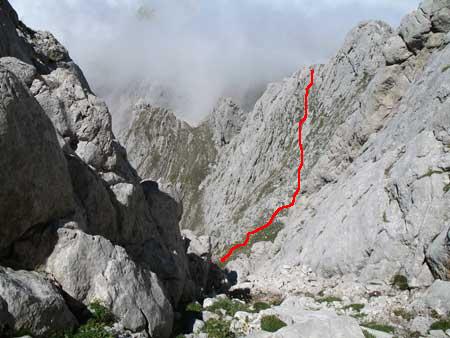 Desde el anterior paso, tenemos que atravesar una inclinada ladera aprovechando algún que otro resalte (se aprecia el recorrido casi horizontal en la primera foto), y con el extremo cuidado de caída ya que sería causa de aterrizar sobre la fuente Prieta, hasta embocarnos en una canal que se forma entre el cordal y un hombro saliente a la derecha. Esta canal la ascendemos agarrándonos sin dificultad. Como toda canal, es imprescindible poner gran atención por los desprendimientos sobre otros compañeros. Es necesario agarrarse alguna vez con las manos.