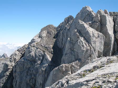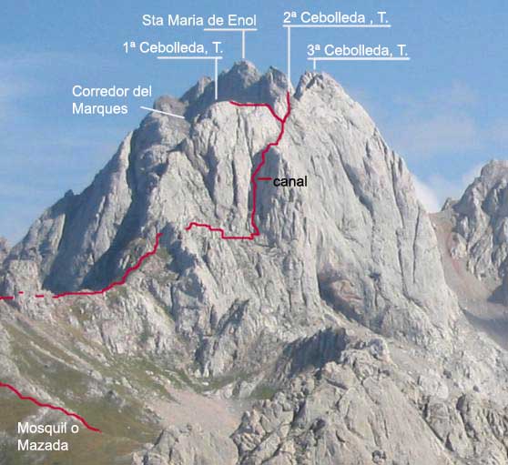 La descripción la hacemos a partir de la collada de la Mazada o Mosquil de Cebolleda. Para el acercamiento a este lugar, ver la ruta de acercamiento a Santa Maria de Enol. Salimos con dirección SE. y mirando hacia adelante marcamos el camino a seguir. Un zoom sobre la foto nos delata la silueta de otros que nos preceden. Ascendemos por la loma del cordal, la cuesta de Cebolleda, por zona alternada de hierba y roca. Dejamos a nuestra derecha un primer resalte, para descender unos metros y continuar , por lo más evidente hasta encontrarnos con la primera muralla rocosa que nos deriva por un estrecho paso a la derecha, dando vista a la Torrezuela y el Jou LLuengu