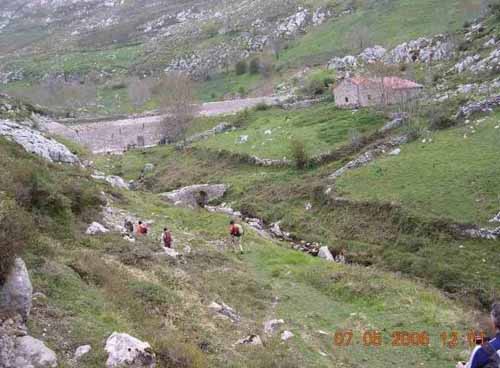 Al salir de este bosque, faldeamos el Cueto Redondo hacia la izquierda, para llegar a la presa abandonada del río Sobra; si bien cruzamos antes por el puente de los Casares.