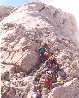 En un principio esta cumbre parece inaccesible, pero al acercarse vemos una canal ( ver fotografía de abajo) por donde tenemos que trepar, para tirarnos a la izquierda por zona menos inclinada de escalones que nos llevan a una corta trepada final hasta la cima. Es imprescindible utilizar las manos en la subida.