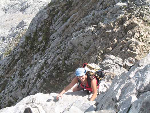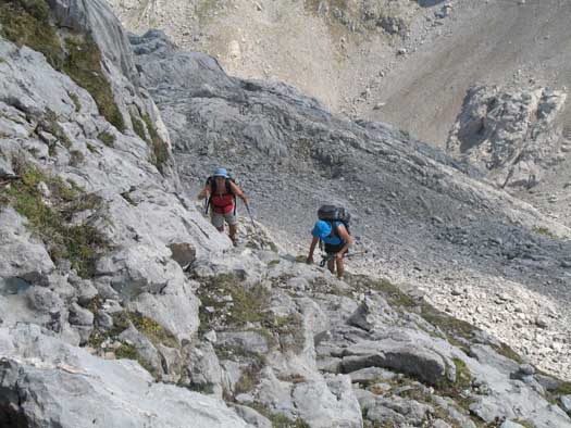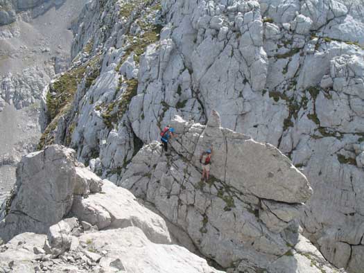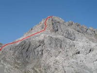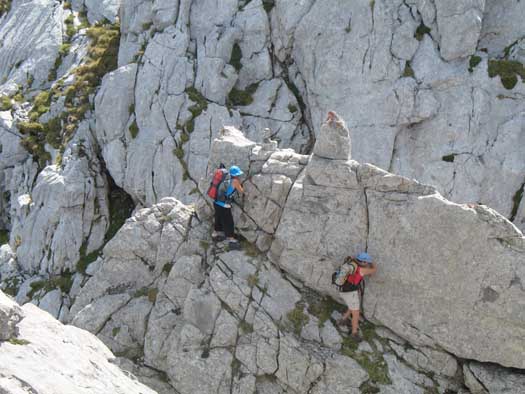 Para ello destrepamos a la parte contraria de nuestra llegada al pico Valdominguero,hasta un colladín desde el que no se ve aparente salida, pero que debemos acometer de frente la roca del saliente y encaramarnos en lo alto de él. No debemos confundirnos con algunos rastros de intentos de rodeo a ambos lados de la peña, hay que trepar.