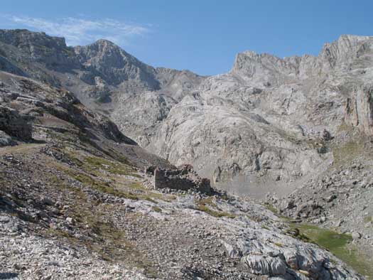 Desde aquí se toma el camino que por la izquierda del refugio lo rodea hacia su fachada trasera, y tras varios serpenteos, de nuevo al el S., gana altura hacia la collada de la Aldea. De este remanso salimos por un camino carretero de los que se construyeron para alivio de las minas, hacia el O.