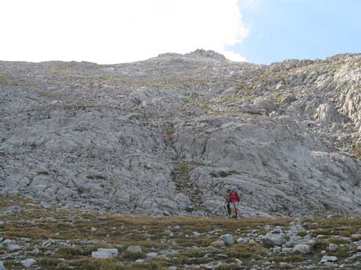 La peña que forma el collado Valdominguero, por la derecha ,es nuestro pico objetivo.de nuestra derecha,N., es el Pico Valdominguero. Solo tenemos que derivar a la derecha siguiendo alguno de los senderos que lo rodea, para encarar adentrándose a en su prominencia por una amplia cicatriz que por al O. asciende sin mucha dificultad hasta la cima.