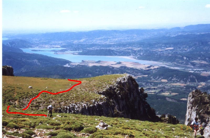 | La descripción del terreno es fácil. Hay que subir y subir hasta llegar a esta zona más llevadera de pendiente con un gran barranco a nuestra izq. Mirando hacia atrás vemos el embalse de Mediano y el asentamiento de Ainsa a orillas del Cinca. | |||