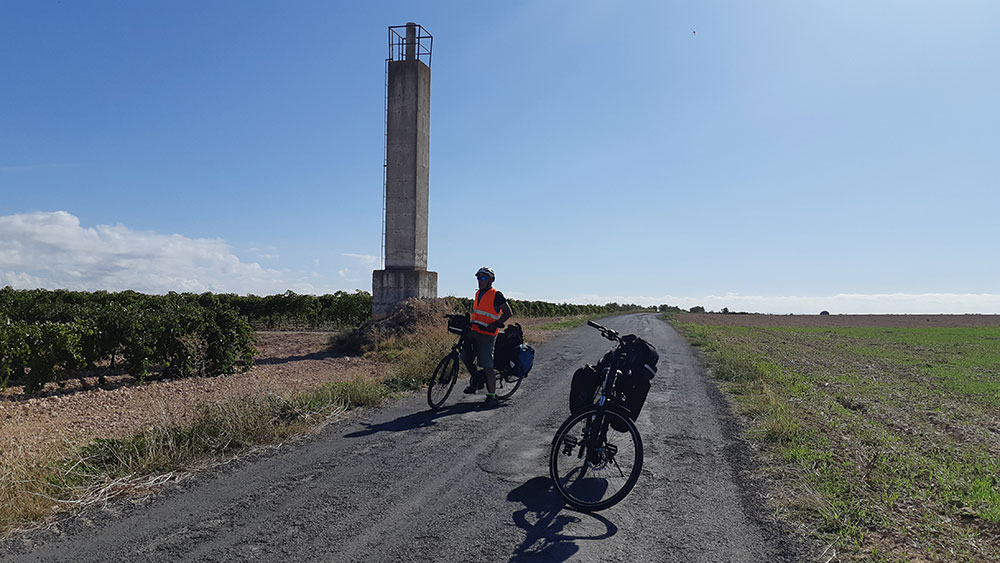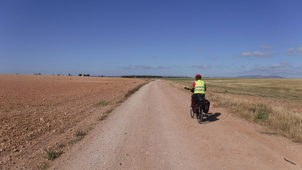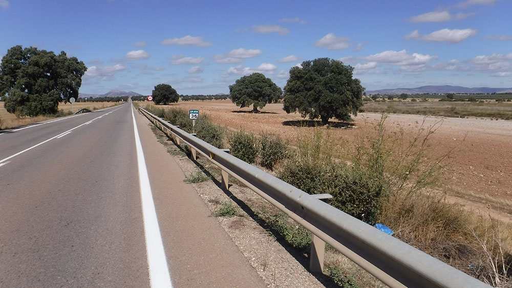Al salir de Fernan Caballero, nos abocamos a la nacional N-401. Aunque al principio parece que por la decha. hay una pista que se puede seguir, ésta se cierra y tenemos que salirnos a la carretra, por lo que mejor tomarla desde el principio. La N-401 tiene mucho tráfico, al menos nosotros lo padecimos. Menos mal que es un tramo corto hasta Peralvillo, donde nos salimos para coincidir de nuevo con el GR114 Camino Natural del Guadiana.