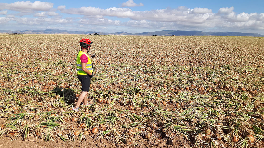 Las plantaciones de viñedos se suceden pero nos llamó la atención este cultivo de cebollas que no habíamos visto hasta ahora. Es una extensión enorme de cebollas.
