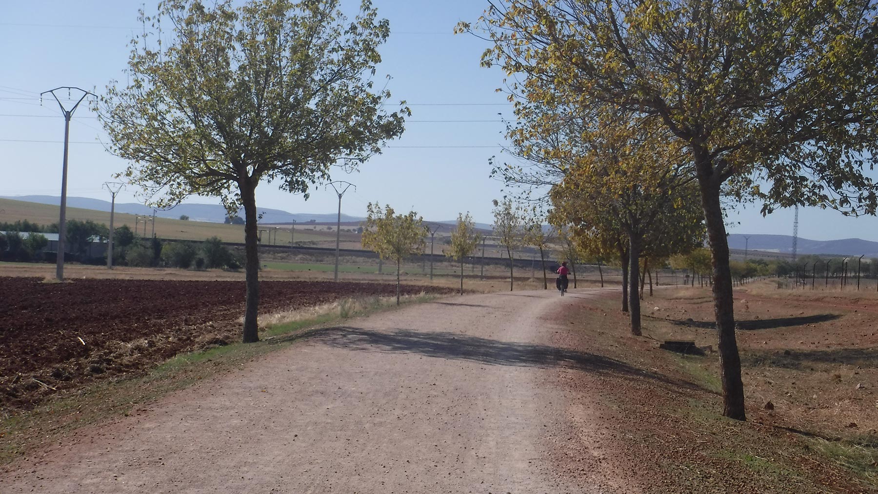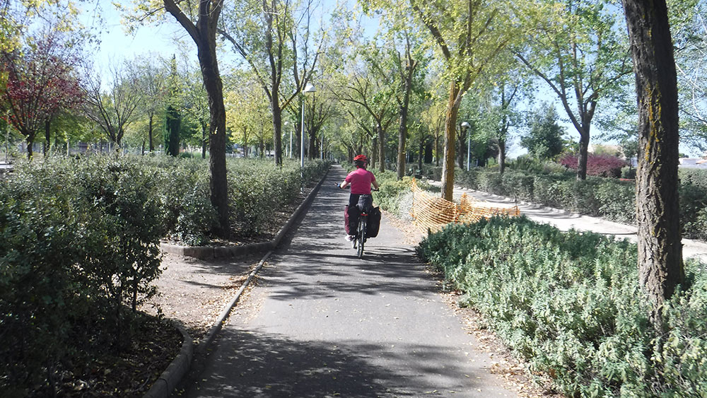Por carril bici, vamos por el parque Gasset en busca del comienzo de la Vía Verde que nos llevará muy cerca de Poblete. Es un poco incómodo de ir por él, por lo irregular del pavimento y de los salientes que las raíces de los árboles originaron