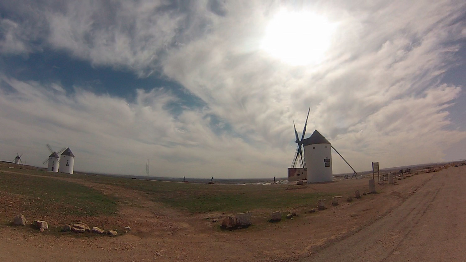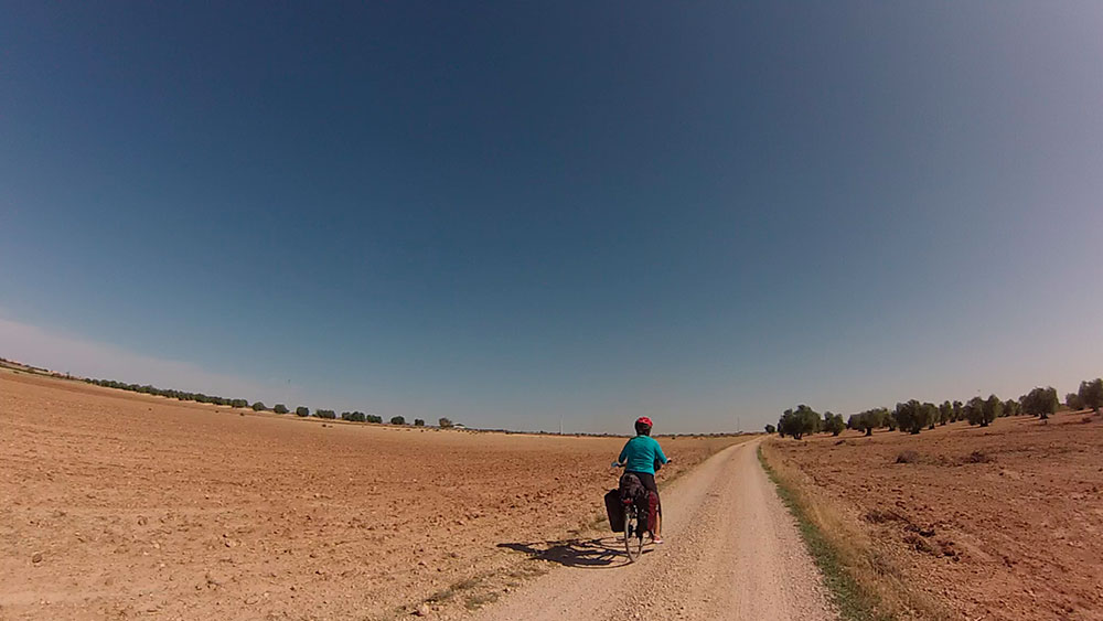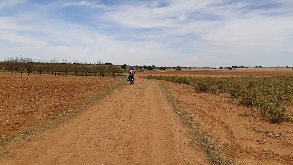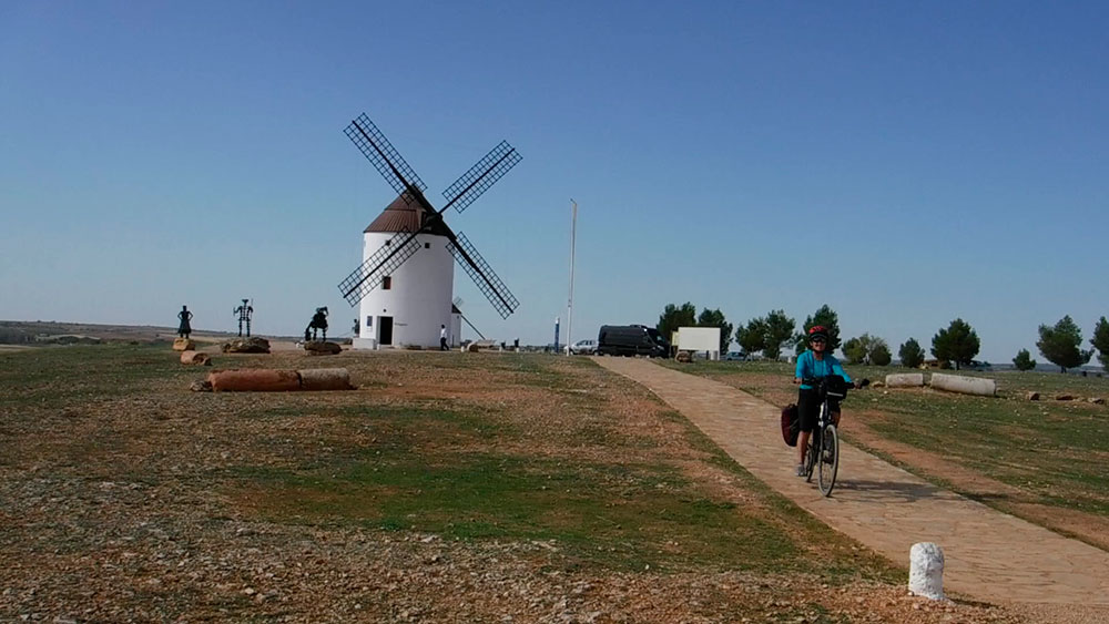 Etapa con la parte culmen de los molinos de viento de Mota del Cuervo y final en todo un referente como Toboso, donde pernoctamos. Circulamos mayoritariamente por pistas, de las que hubo algunas en un estado lamentable de piedras,para nuestro pedaleo, antes de llegar a Pedro Muñoz y luego todo lo contrario, ejemplo de buena pista. En todo el recorrido notamos intensa actividad en la vendimia.