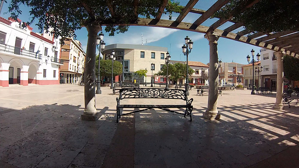 Plaza del Ayto. Con pérgolas en la fachada de Ig. San Pedro y ayuntamiento de Pedro Muñoz a la ziq.