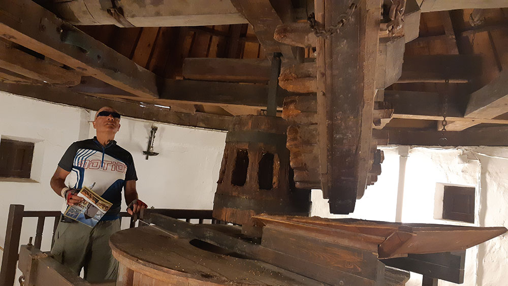 Entramos al molino de nombre "Gigante" que es visitable y tiene con antigua reconstrucción, toda la maquinaria necesaria para hacer una molienda. Así lo hacen cada sábado, ya que ese día visten con las velas las aspas del molino y lo ponen en funcionamiento haciendo una molienda tradicional en toda la regla.