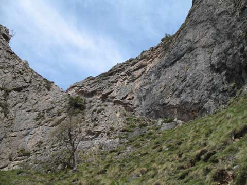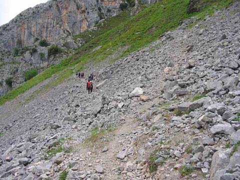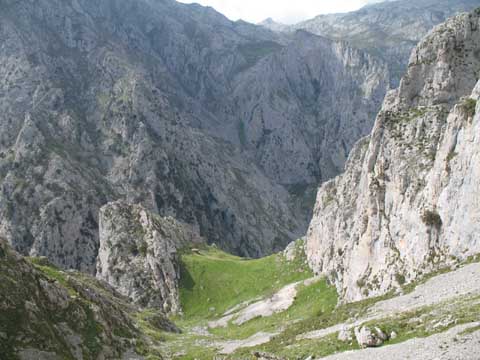 Cuando llevamos un buen tramo de descenso miramos hacia atrás y vemos el pedregal superior de la canal de Piedra Bellida que se esconde en retorcida a la izquierda ,y el verde hacia el Horcado Turonero a la derecha.