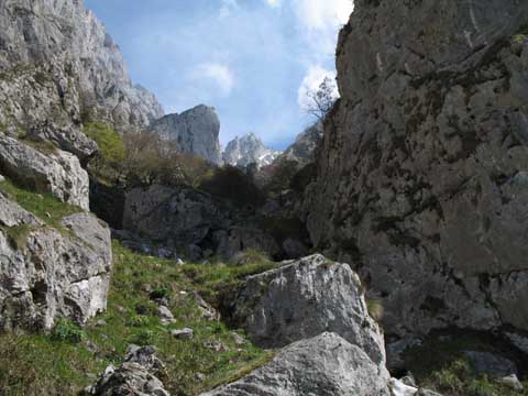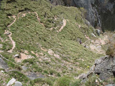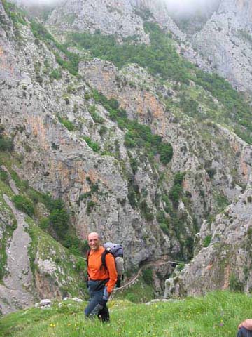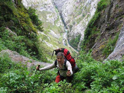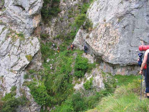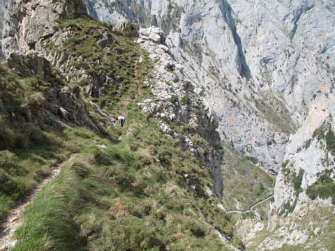 Por los peldaños de piedra del Travieso Cámara llegamos a la cueva Camara, no sin antes superar enormes dudas de orientación. El Cares se despliega al fondo.