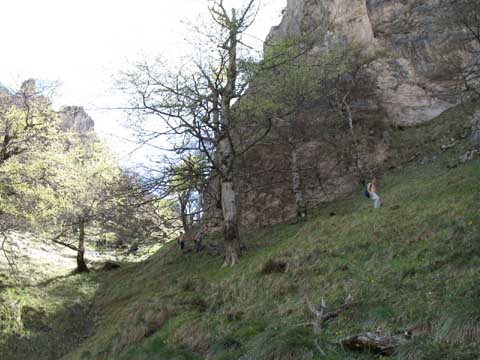 La pasada del collado es hacia un buen bosque que tomamos en descenso . La tendencia tiene que ser a la derecha evitando la natural caída del mismo que nos metería muy abajo en los inicios de la canal de Ría.