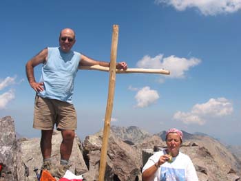 Descripción : Desde Lozzi- Aquale (1080m), tomamos una pista practicable por vehículos todo terreno, y por aquellos otros que se atrevan a poner a prueba sus amortiguadores, que sale hacia el E. primero, para girar en poco tiempo hacia el NE. bordeamos el camping y con amplios zig-zag vamos ganando altura. Esta es la parte más pesada del acercamiento, pudiendo cortar las curvas de la pista y evitar con ello la molestia de los coches, que dicho sea de paso son bastante solícitos en ayudar. Pronto llegamos a lo considerado como aparcamiento final, y refugio de Petra Pinzuta (1575 m), lugar donde entre otras cosas sirven comidas. Hasta aquí el caminar nos podemos evitar utilizando el vehículo apropiado. Iniciado el camino por senda amplia y bien marcada, con fácil caminar salvo un ultimo requiebro, pronto llegamos al refugio de L'Erco (1667 m) con guarda de origen italiano. Aquí comienza la subida, y es conveniente coger agua en la fría fuente que este lugar nos ofrece. La senda de ascensión hace numerosas revueltas por la “Pietra Fisculina” y va remontando sin pérdida ninguna la ladera sur del conjunto que forma el Cinto, ya que la cima como tal, se encuentra tras el murallón de la primera vista. El camino de subida está perfectamente señalizado por marcas de pintura y solamente hay que seguirlo; si bien es cierto que hay que estar atento porque existe alguna señalización con desvío equivocado o en todo caso, de peor caminar. Es una ascensión fácil y dura por ser ladera sur y el sol aprieta en el verano, como la ola de calor del año 2003. En la cima es corriente encontrarse con lo que podríamos llamar genéricamente "cuervos" de gran tamaño. El descenso lo podemos hacer por el mismo lugar de subida o siguiendo la cresta que desciende hacia el SO. en dirección al lago Cinto (2290 m), y desde aquí continuar al E. por la cuenca del arroyo L’Erco, hasta el refugio del mismo nombre para enlazar con el camino de subida. |
