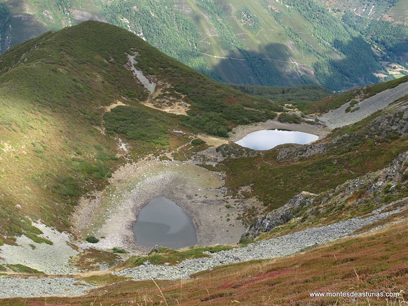 Superada la cuesta llegamos al valle de Fasgueo, donde se aprecia la senda que proviene del alto San Antón o Valdeprado. Las lagunas se encuentran en dos niveles distintos. Sorprende verlas porque es inimaginable que allí estén.