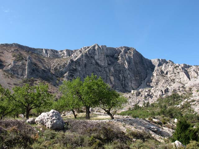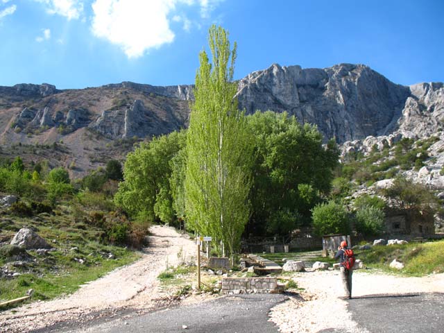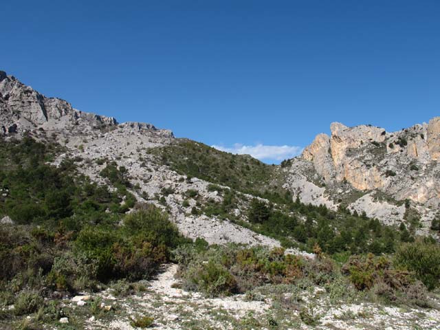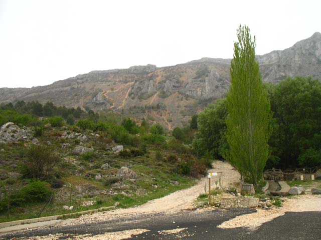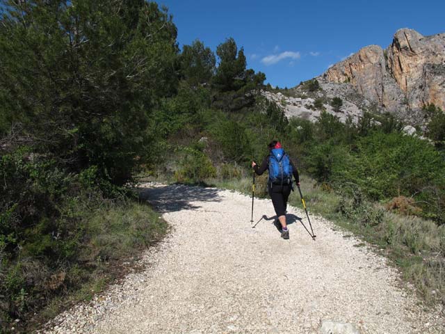 En Font Partegat comenzamos a caminar. Una pista se dirige hacia un murallón rocoso derivando a al dcha. hacia la collada verde.