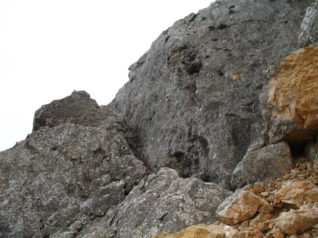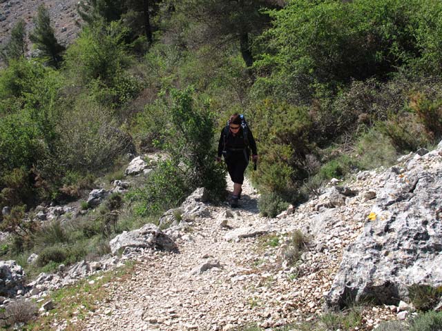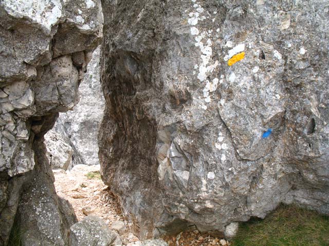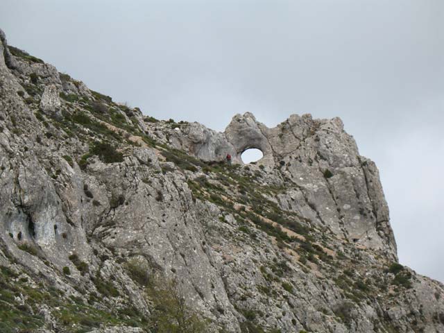 En el collado giramos totalmente a la izq. sobre las marcas de un PR y dirigiéndonos hacia un gran ojo en la piedra