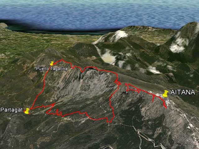 El lugar donde dejamos el coche y que se encuentra la fuente de Partegat, es el fondo de un circo rodeado de montañas. En la dirección que traíamos con el coche, de frente hay un gran murallón montañoso y a la derecha hay una collada verde hacia donde nos dirigimos. En vez de hacerlo directamente, vamos hacia el murallón por una pista, siguiendo las marcas del Sender Botanic del Passet y la Rabosa. esta pista gira hacia la dcha. y se convierte en camino, que nos pasa por el collado antes mencionado. Desde este collado podemos ver Beniardá y su embalse. El camino pronto se convierte en sendero y con suave inclinación nos acerca a un gran collado superior, con la vista a nuestra derecha sobre una finca con casa que cada vez queda más cerca. En el tránsito pasamos por una zona bastante húmeda que se confunde el camino con el reguero, y poco después al lado de una buena fuente con pileta. En las proximidades de este gran collado o puerto, ya se aprecia el conjunto de antenas y alambradas que ocupan el espacio militar en la cima del monte Aitana. El camino ya se vuelve pista y situados sobre este gran collado, en la Font Forata, al frente podríamos arremeter hacia la zona rocosa de la cima, pero nosotros retrocedemos al SE siguiendo las marcas de PR con intención de rodear un gran ojo, muy curioso, que se forma en la piedra en lo alto. El camino está jalonado de letreros con indicación botánica. Un senderillo a nuestra derecha, con fuerte subida, nos llevaría hasta el ojo de piedra. De nuevo sobre el camino, este nos lleva a una zona angosta, el Pas de la Rabosa,que tras un serpenteo ascendente entre bloques pétreos hace el paso por un hueco entre las rocas. Ahora sólo nos queda hacer un pequeño descenso para salvar los cortes de las Simas de Partagat, y retroceder ascendiendo para que en pocos minutos lleguemos a una precima del Aitana. Continuando un poco más nos acercamos al cierre metálico donde se encuentra la cima del monte Aitana. El retorno lo hacemos a enlazar con el camino de subida hasta la Simas de Partagat, y allí continuar al E por toda la cuerda de la Peña Alta (1505) y el Alto de la Tagarina, con algún altibajo, teniendo ahora a nuestra izq. en el fondo del valle, la fuente de Partegat y nuestro punto de partida. El descenso lo podemos hacer siguiendo el camino hasta el puerto Tagarina donde se enlaza con el camino pista de Sella hasta Partegat, o bien en una de las colladas de paso salirse del camino y descender por la pedrera casi entera, una verdadera gozada, deslizándose a Partegat.