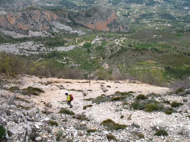 El descenso lo hacemos hasta el borde de la sima Partegat y luego continuamos a la dcha. por un sendero que transcurre por la Peña Alta y Alto de Tagarina, teniendo en el fondo a la vista, a la izq. el aparcamiento donde comenzamos a caminar