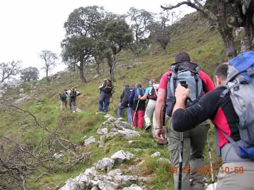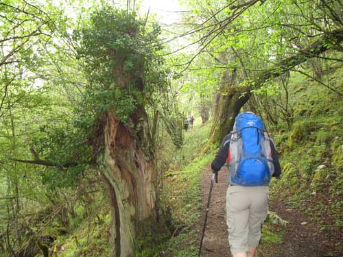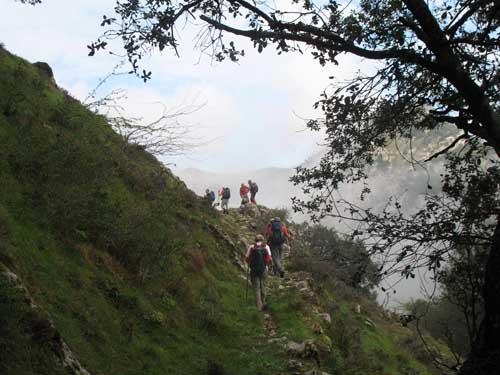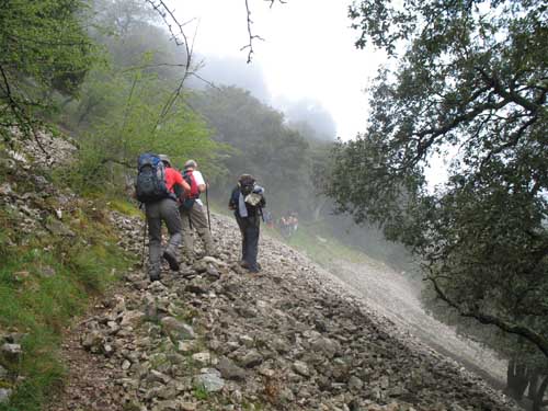 La vegetación nos invade el camino, impidiéndonos ver el paisaje que nos rodea, discurriendo en dirección SO. Pronto cruzamos una canal pedregosa que divide al monte